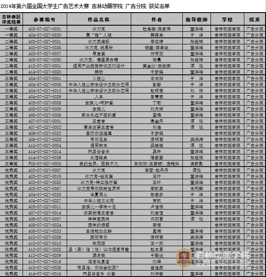 近日,2014年第六届全国大学生广告艺术大赛(吉林省赛区)评比结果揭晓,广告分院师生参赛作品喜获佳绩。广告分院董洪峰老师指导的学生作品《冰力克》、于洋老师指导的学生作品《墨“指”人祖》获本届大学生广告艺术大赛全国平面类作品一等奖。