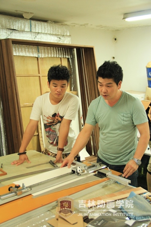 具成守先生(右)在为中国学生示范画框制作