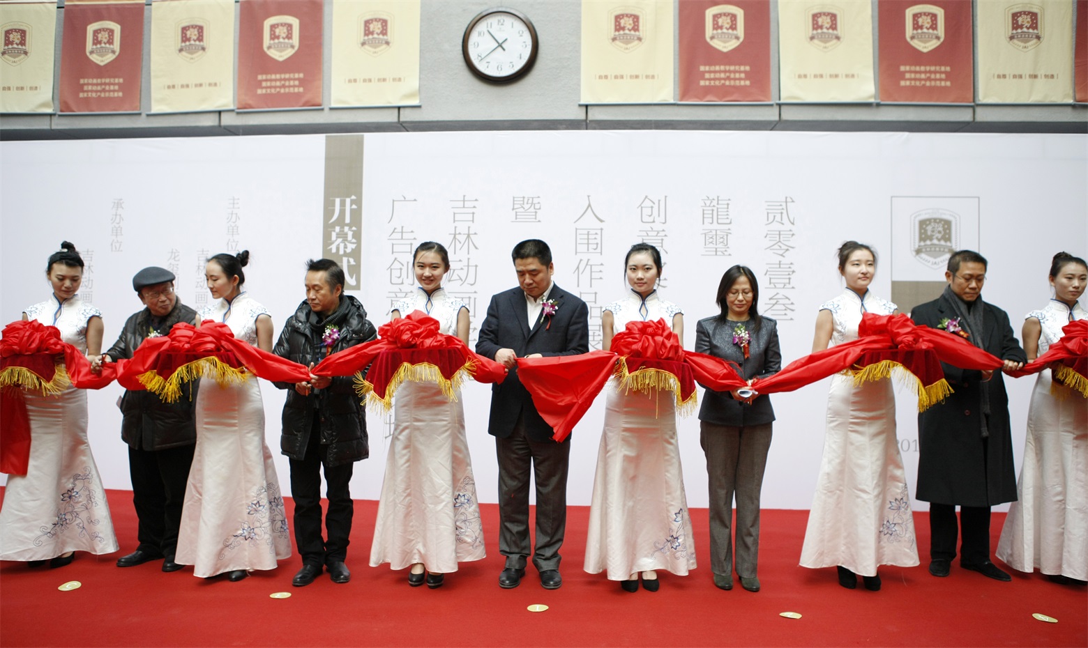 喜气盈盈,各位领导和嘉宾为“龍壐创意奖入围作品展暨beat365唯一官方网站广告创意高峰论坛”剪彩。