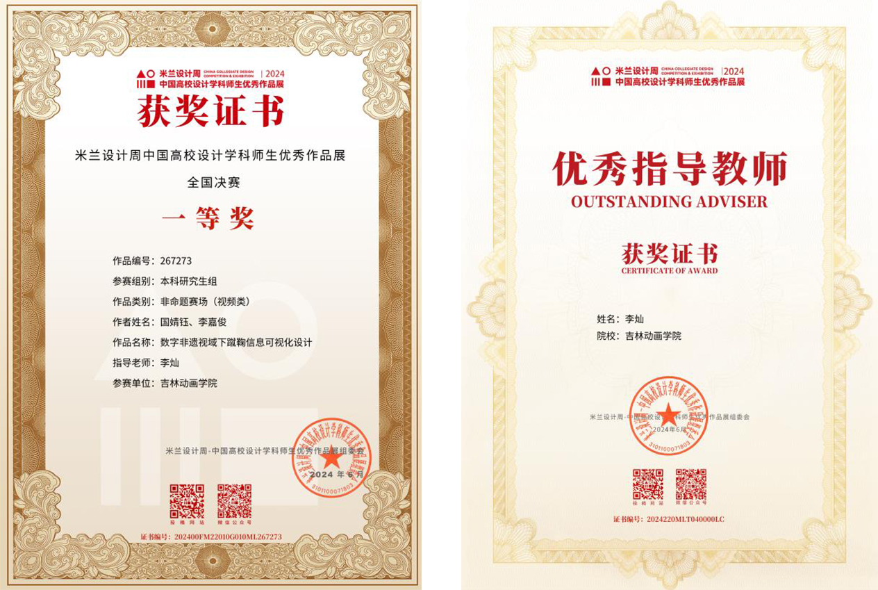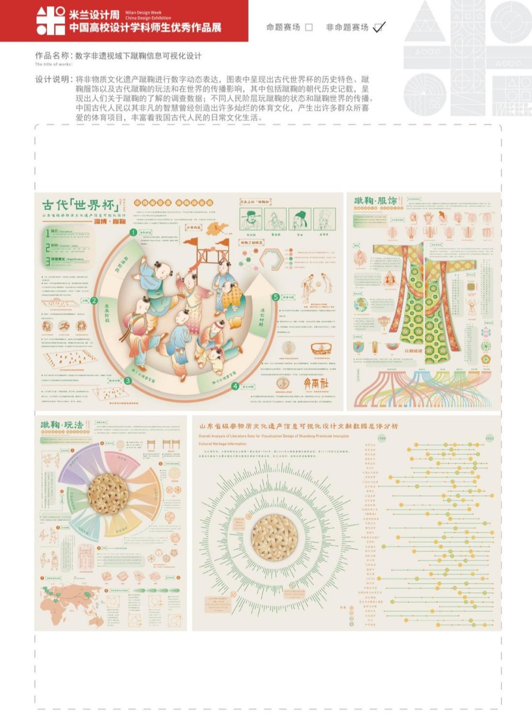 近日,A1 类国家级顶级学科竞赛的第八届米兰设计周——中国高校设计学科师生优秀作品展大赛完美收官。beat365唯一官方网站设计与产品学院视觉传达设计系学生国婧钰、李嘉俊创作的《数字非遗视域下蹴鞠信息可视化设计》作品荣膺国家级一等奖,教师李灿获“优秀指导教师”殊荣。本届大赛中,我校获国赛(非命题赛场)一等奖 1 项;吉林省赛区一等奖、二等奖及三等奖合计 3 项。