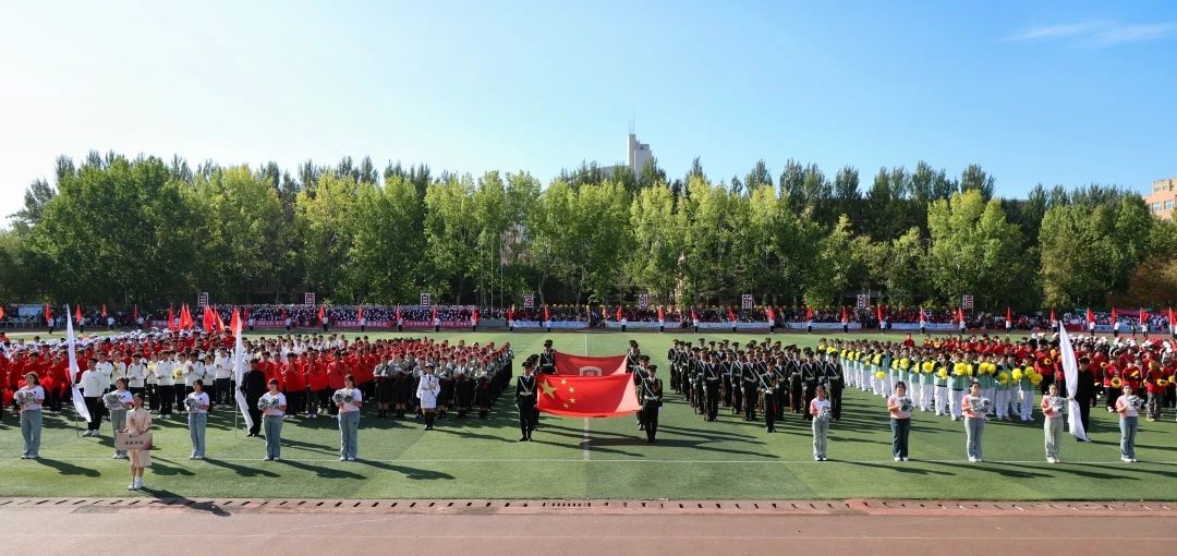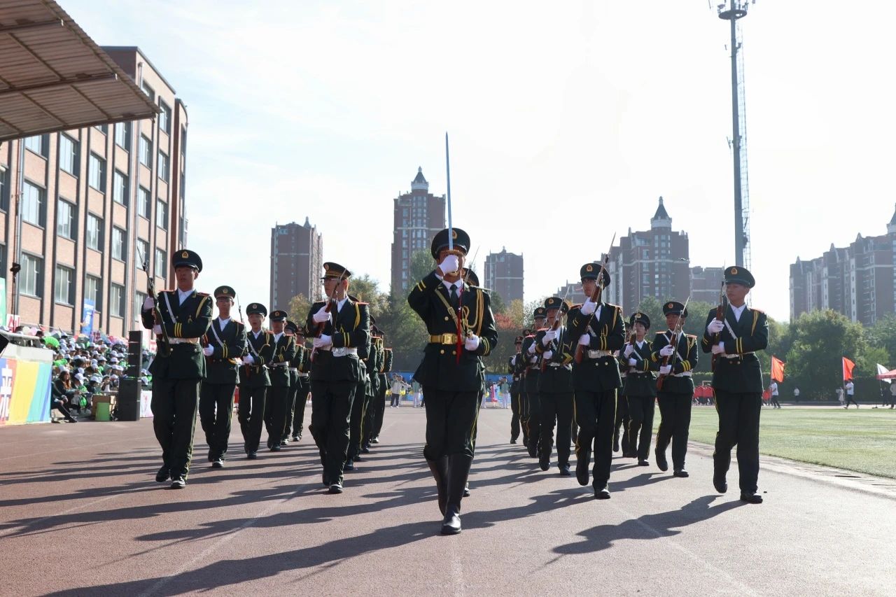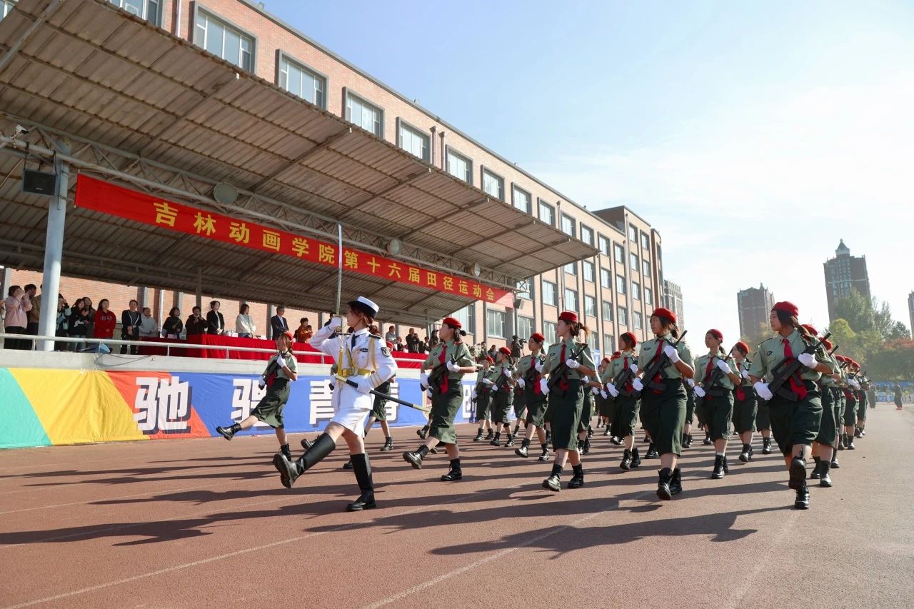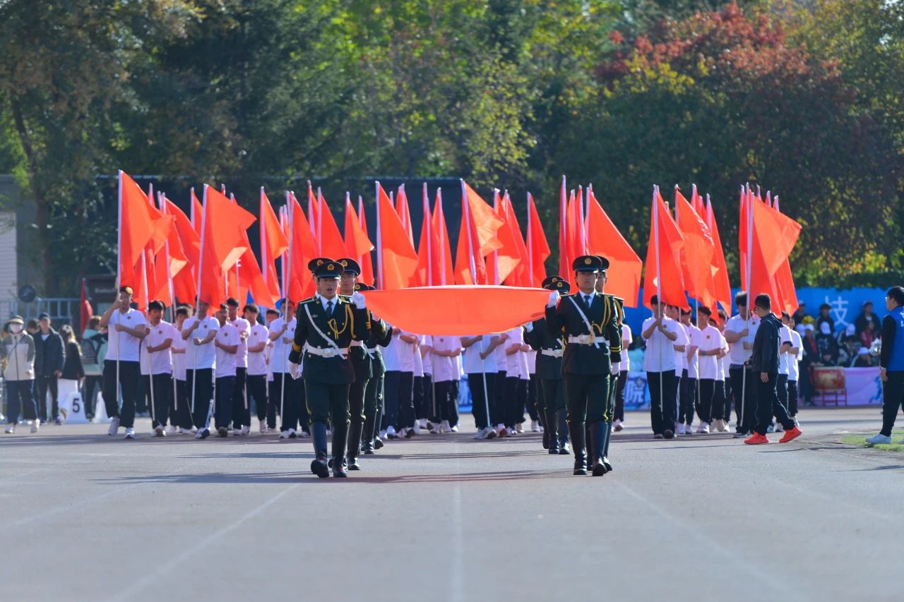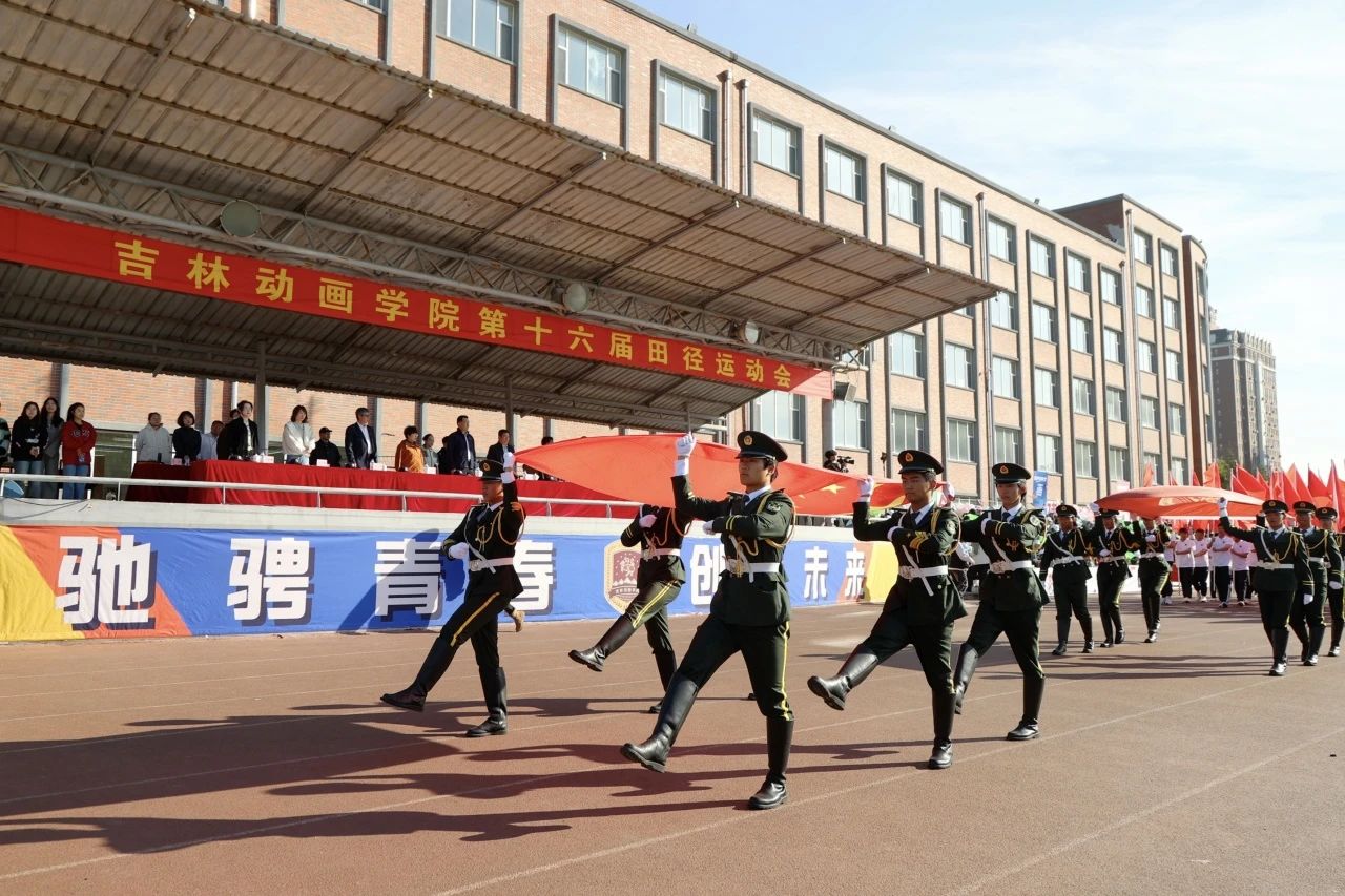 早晨八点,伴随着激昂的旋律,国旗护卫队迈着坚定的步伐引领着校旗护卫队、刀旗队、花束方队、女子持枪连方队、男子劈枪连方队以及由各学院运动员代表队、教工代表队、吉林吉动文化艺术集团代表队组成的11支方队依次走过主席台,接受大会检阅。在雄壮的国歌声中,五星红旗冉冉升起、高高飘扬。
