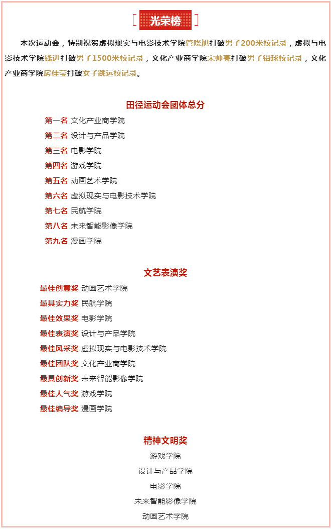 刘振华赞扬我校全体师生员工在本次运动会上,用行动展现了良好的吉动风貌,体现出团结友爱的吉动品质,诠释了高度的集体荣誉感与吉动力量。他希望全体师生员工把运动会上的拼搏精神和团结合作带到今后的学习和生活中去。在追求梦想的道路上,勇敢地面对挑战,坚持不懈地努力,时刻以“自尊、自强、创新、创造”的校训精神激励自我,提升自我,加强学习,不断提高学业成绩和艺术创作水平。