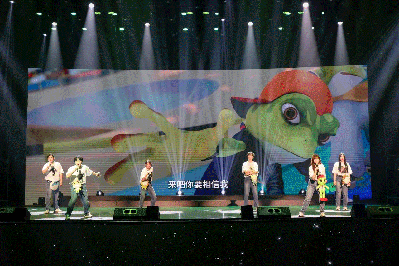 吉动同学们化身动画电影《疯狂电脑城》与《青蛙王国》中的灵魂角色,以声为笔,细腻勾勒角色的性格轮廓,深情演绎情感的波澜起伏,使观众享受一场纯真与温暖交织的双重感官盛宴。由吉动原创系列动画电影《青蛙王国》主题歌曲《爱情发的光》改编的歌曲《动漫发的光》,及歌曲《不落的彩虹》《一起来吧》,每一帧精致画面与歌声悠扬交织,灯影绚烂间一个个经典动漫形象令人沉醉。3D大屏上展映出《青蛙王国》角色的炫动滑板滑行,如同灵动的飞鸟,难度高,完美诠释了极限运动的青春与激情。