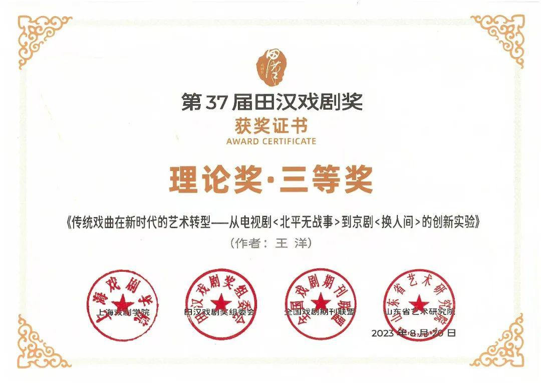 日前,2023年第三十七届田汉戏剧奖揭晓。我校电影学院教师王洋凭借理论文章《传统戏曲在新时代的艺术转型——从电视剧<北平无战事>到京剧<换人间>的创新实验》在本届评选中脱颖而出,喜获理论奖三等奖。这是我校首次获得田汉戏剧奖,实现了历史性突破。