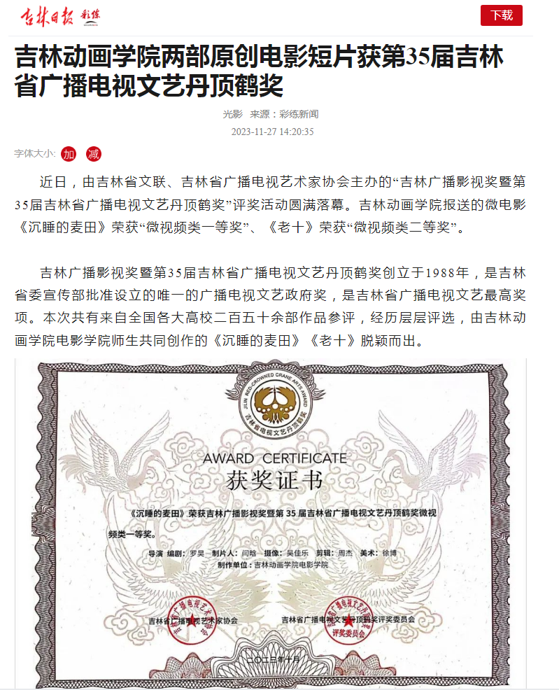 吉林广播影视奖暨第35届吉林省广播电视文艺丹顶鹤奖创立于1988年,是吉林省委宣传部批准设立的唯一的广播电视文艺政府奖,是吉林省广播电视文艺最高奖项。本次共有来自全国各大高校二百五十余部作品参评,经历层层评选,由beat365唯一官方网站电影学院师生共同创作的《沉睡的麦田》《老十》脱颖而出。