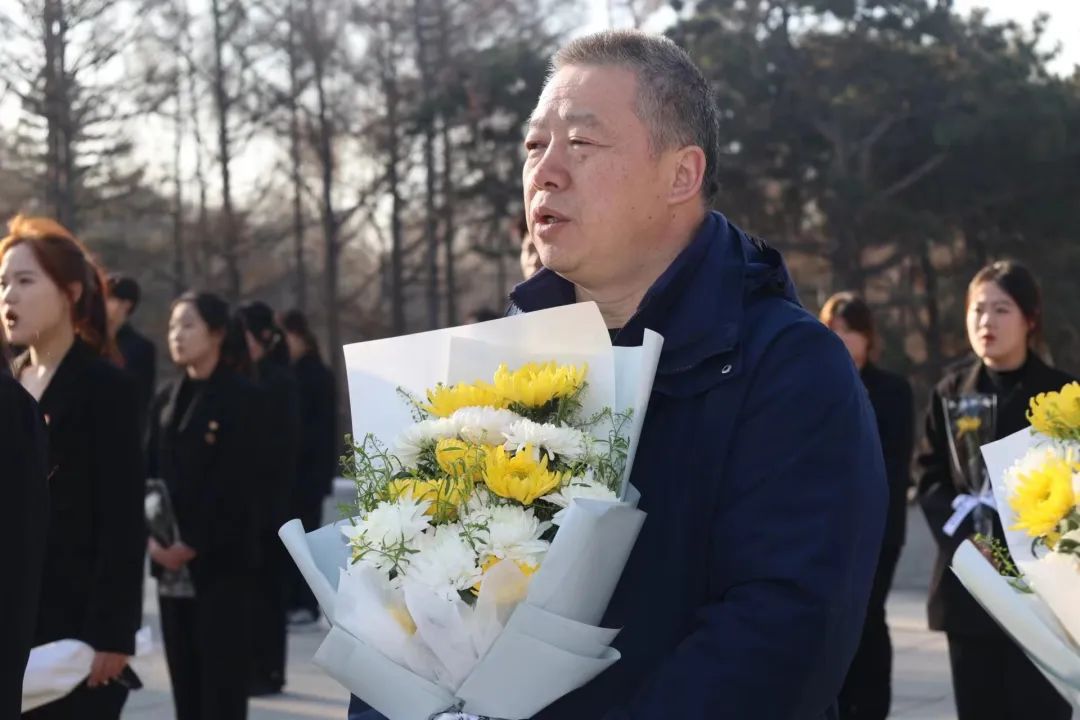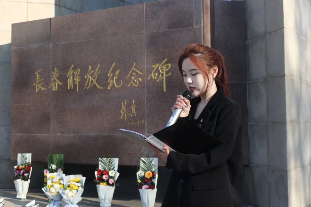 早上7:00,我校师生代表们在指定地点站队集合,前往长春解放纪念碑。纪念碑高耸入云,仿佛在诉说着那段峥嵘岁月。师生们奏唱国歌,伴随着主持人主持开场,老师与学生干部们在默哀后上前献花。献花完毕后,校学生会的四位学生干部李文慧,张琪秀慧,赵小娴,蔡龙熙用一场激昂的朗诵,带我们重温了那段难忘的历史,提醒我们要铭记先辈嘱托,让历史的记忆化作奋进的力量,融入中华民族生生不息的精神谱系。
