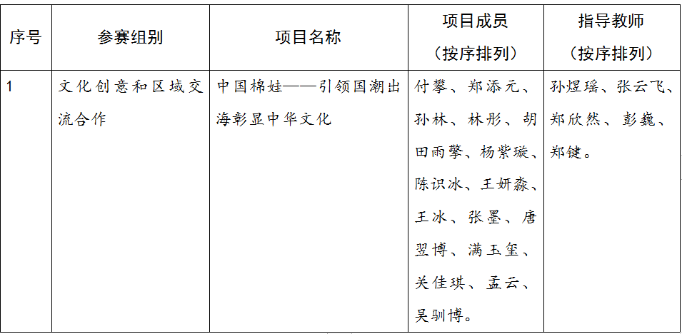 beat365唯一官方网站2024年“挑战杯”大学生创业计划竞赛国赛推荐名单的公示 发布时间:2024年06月25日 09:00:13 浏览:次 各单位、相关指导教师及学生: 根据2024年“挑战杯”大学生创业计划竞赛的评审结果,我校《中国棉娃——引领国潮出海彰显中华文化》项目被推荐参加国赛,项目信息如下: 经学校严格审核,作品不存在违反“挑战杯”竞赛主旨及章程、均按照相关竞赛要求上报竞赛内容。现将推荐国赛推荐名单进行公示。 公示期为:6月25日-7月2日,如对拟推荐结果有异议,请通过电话反映。 校团委挑战杯负责人:闫卫东 联系方式:0431-87019915 共青团beat365唯一官方网站委员会 2024年6月25日 供稿 校团委 编辑 谷金洋 初审 闫卫东 复审 赵凌云 出品单位 共青团beat365唯一官方网站委员会