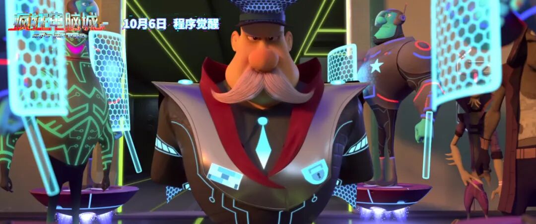 此外,《疯狂电脑城》将这种艺术设计还贯穿在角色服饰、道具中的细枝末节中,主角扎普的衣服上流动、闪烁着的“电子血液”,寓意信息的流动与充能。“将军”与“卫兵”的帽子、盾牌上排列有序的“蜂巢”元素,象征着坚不可摧的网络安全力量。预告片中出现正邪双方决斗的武器,也多以激光的形式表现。此类种种细节每时每刻提醒着观众:这里是“科技满载”的电路城!