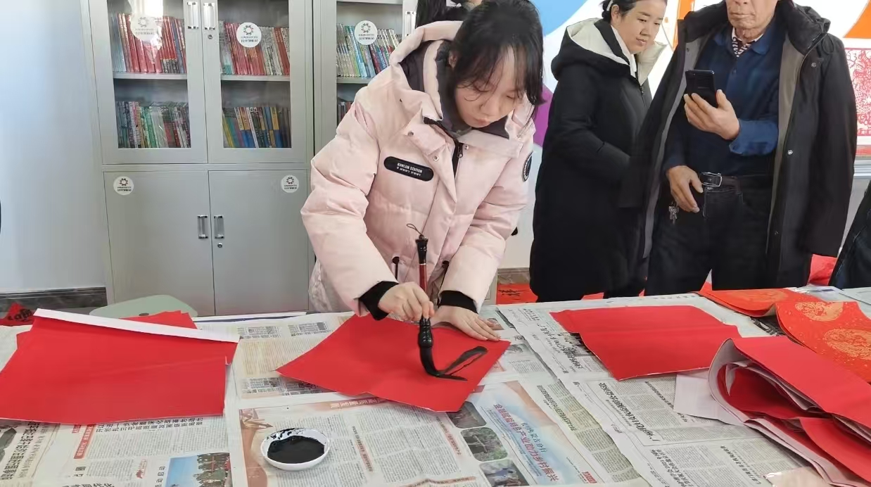 在参加“挥毫泼墨迎新春,赠福送暖过大年”的写春联社区实践活动时,我铺开红纸,蘸满墨汁,提笔写下“福”字的那一刻,心中涌起一股难以言表的感动。一位老爷爷拿着春联感慨地说:“现在会写毛笔字的年轻人越来越少了,你们能来写春联,真是太好了!”这句话让我意识到,作为新时代的青年,我们应当主动肩负起传承和弘扬中华优秀传统文化的重任,让中华优秀传统文化代代相传,永不磨灭。