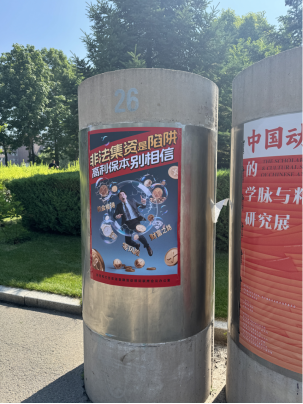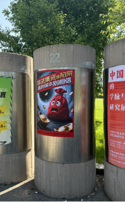 通过悬挂主题条幅、张贴宣传海报等形式,在校园内营造防范非法金融活动氛围。在宿舍区、中央大道公共区域悬挂和张贴,更为直观地提醒学生警惕“校园贷”“非法集资”“网络诈骗”等陷阱,切实做到“不轻信、不参与、不传播”。
